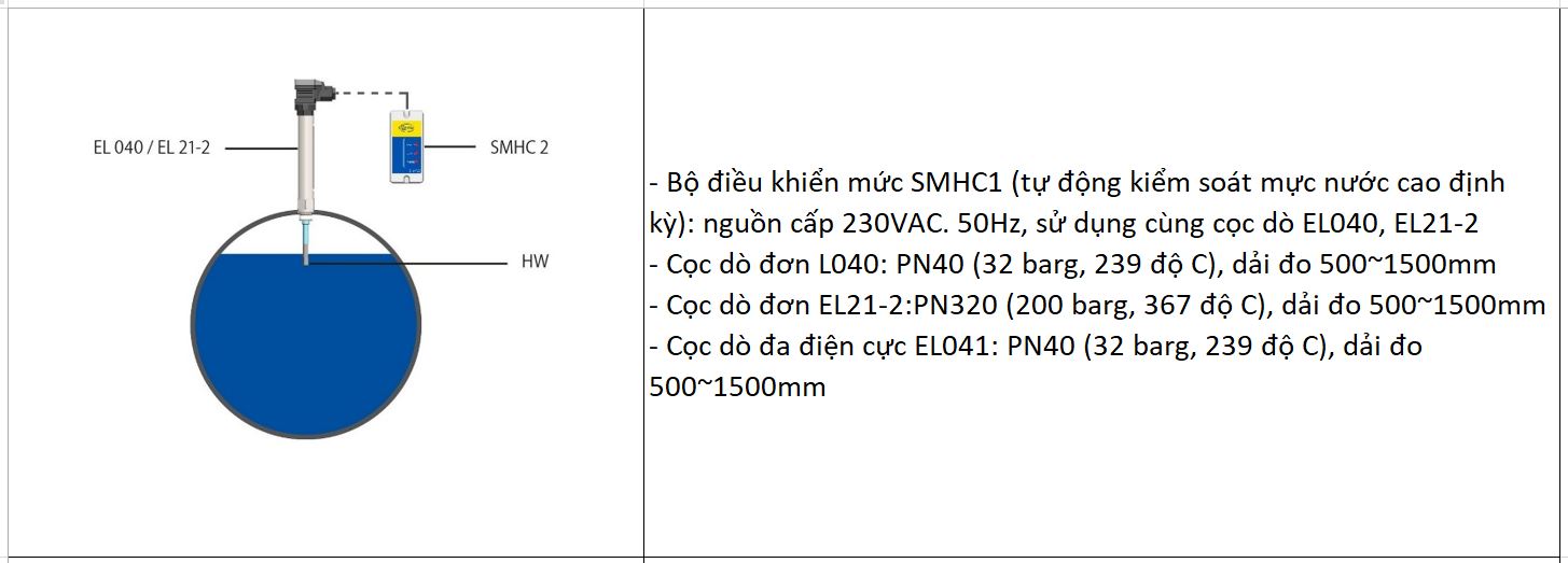 - Bộ điều khiển mức LMC 1 (kiểm soát mực nước thấp có kiểm tra tự động định kỳ): nguồn cấp 230VAC. 50Hz, sử dụng cùng cọc dò EL041, EL4-1, EL 914