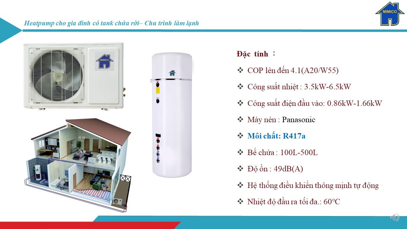 MÁY BƠM NHIỆT MIMICO có tank chứa rất tiện lợi và phù hợp cho các hộ gia đình, nhà nghỉ, khách sạn vv…,