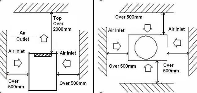 Tất cả các tiêu chí được đưa ra trong các phần sau phản ánh khoảng cách tối thiểu. Tuy nhiên, mỗi công trình lắp đặt cũng phải được đánh giá, có tính đến các điều kiện khí hậu địa phương và khoảng cách và chiều cao của các bức tường ngăn cách, khoảng cách với các khu vực tiếp cận công cộng. Bơm nhiệt phải được đặt có khoảng cách để tạo khe hở ở tất cả các phía để bảo dưỡng và kiểm tra.