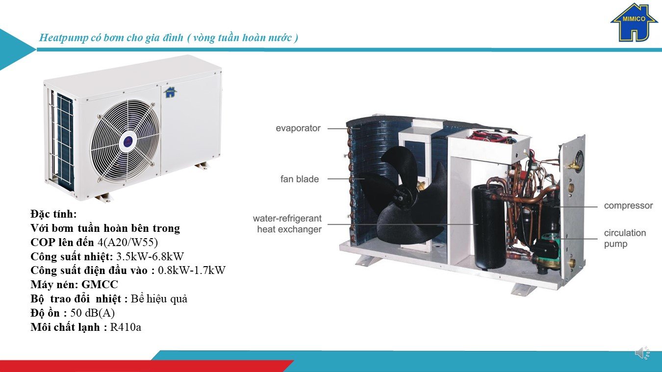 Heatpump MIMICO được trang bị bơm tuần hoàn kèm theo máy, rất phù hợp cho các hộ gia đình, nhà nghỉ, khách sạn vv…,