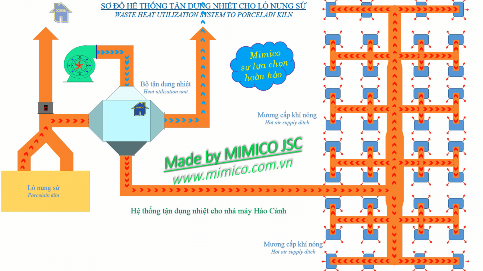 Mimico là đơn vị tiên phong trong nước ứng dụng thành công mô hình tận dụng nhiệt thải từ các nhà máy, giúp tiết kiệm 1 lượng chi phí rất lớn cho nhà máy khi phải xử lí khói thải, đồng thời đem lại môi trường sống trong lành, giảm thiểu tác nhân gây hiệu ứng nhà kính. Những nhiệt dư được thu hồi sẽ đưa vào sản xuất làm giảm chi phí tăng tính cạnh tranh.