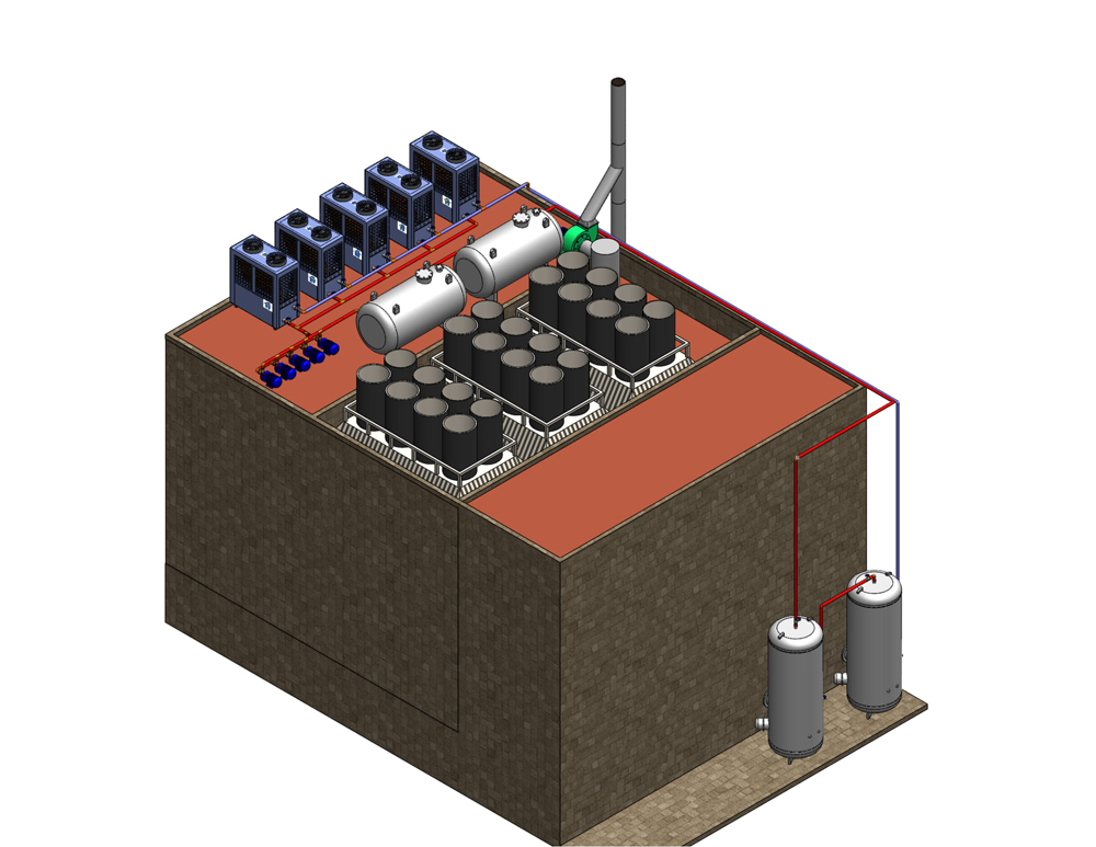 Mô hình phía trên là mô hình cho các hệ thống lấy nhiệt thải có nhiệt độ trên 2000C từ các lò nấu nhôm, nấu đồng, lò nung sứ, nha máy sản xuất kính vv…, hệ thống khí nóng sẽ được thu hồi đi qua hệ thống trao đổi nhiệt tạo ra nước nóng. Phần khí còn lại sẽ tiếp tục được qua hệ thống tháp khử khí “nếu là khí thải bắt buộc phải xử lý” nước nóng được tạo ra sẽ đi vào đi vào bình chứa nước nóng. Từ bình chứa này sẽ được bơm qua hệ thống Chiller hấp thụ chạy nước nóng, hệ thống chiller này sẽ tạo ra nguồn nước lạnh từ 12-70C để làm mát cho nhà xưởng hoặc phục vụ trong sản xuất.
